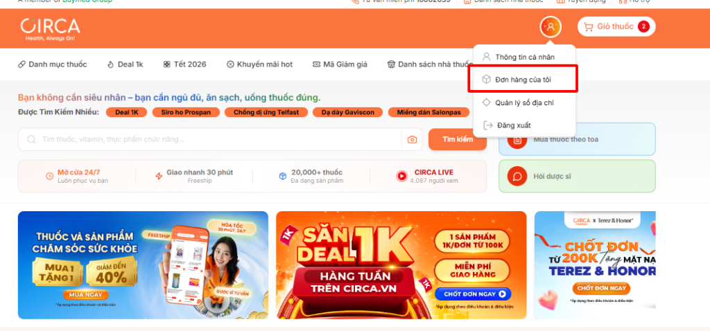 Bước 1: Khách hàng truy cập vào website: https://circa.vn/ vào mục đơn hàng của tôi.
