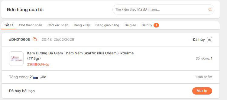 Bước 2: Khách hàng kiểm tra các đơn hàng đã đặt trên hệ thống bằng các trạng thái đơn hàng