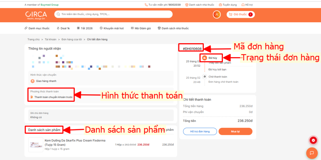 Bước 3: Để kiểm tra cụ thể: mã đơn, danh sách sản phẩm, giá trị đơn, hình thức thanh toán và trạng thái xử lý đơn, khách hàng ấn chọn vào đơn hàng để kiểm tra: