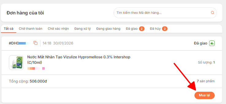 Bước 2: Chọn đơn hàng muốn mua lại và ấn nút MUA LẠI