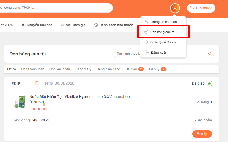 Bước 2: Vào phần ” Đơn hàng của tôi ” kiểm tra các trạng thái đơn hàng hiện tại.
