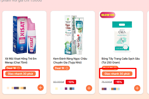 Khách hàng có thể chọn những sản phẩm có nhãn ” Giao nhanh 30 phút ” để Circa giao đơn hàng nhanh chóng tới khách hàng.