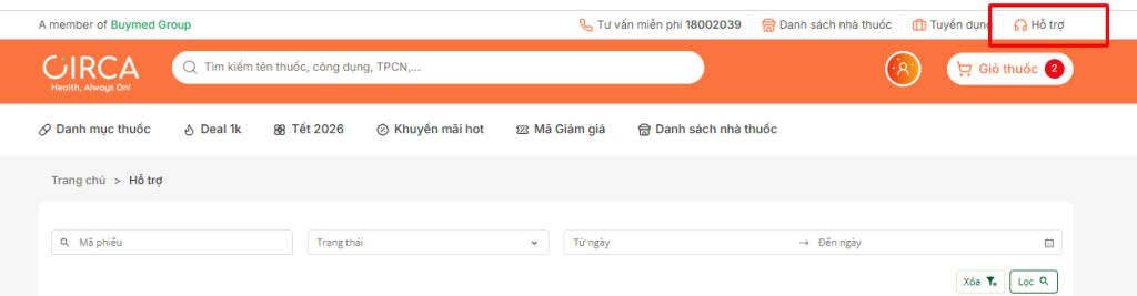 Bước 1: Đăng nhập vào Circa sau đó vào mục ” Hỗ trợ “