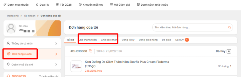 Bước 3: Kiểm tra đơn hàng cần hủy tại mục trạng thái đơn hàng ” Chờ thanh toán” và” Chờ xác nhận”.