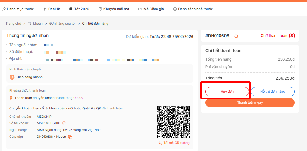 Trường hợp đơn hàng chưa xuất kho và chưa được bàn giao cho đơn vị vận chuyển. Nếu sau khi đặt hàng khách hàng có phát sinh nhu cầu cần hủy đơn, khách hàng có thể tự thao tác hủy nếu đơn chưa được xử lý bằng cách: