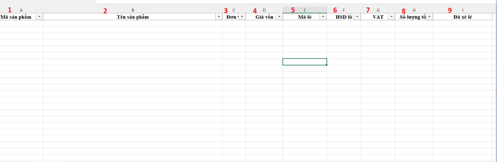 Điền đầy đủ các trường thông tin còn lại bao gồm đơn vị (hộp/viên/vỉ/chai/lọ/tuýp), số lô, hạn dùng, số lượng tồn kho, VAT đầu vào, giá vốn của sản phẩm để hoàn thiện file.