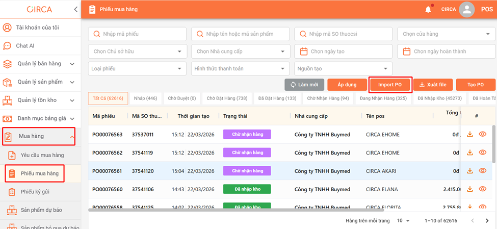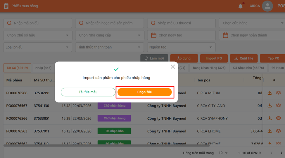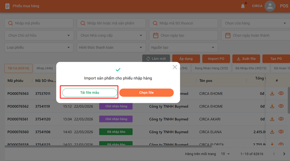 Vào trang admin -> Mua Hàng -> Phiếu mua hàng -> Import PO -> Tải file mẫu