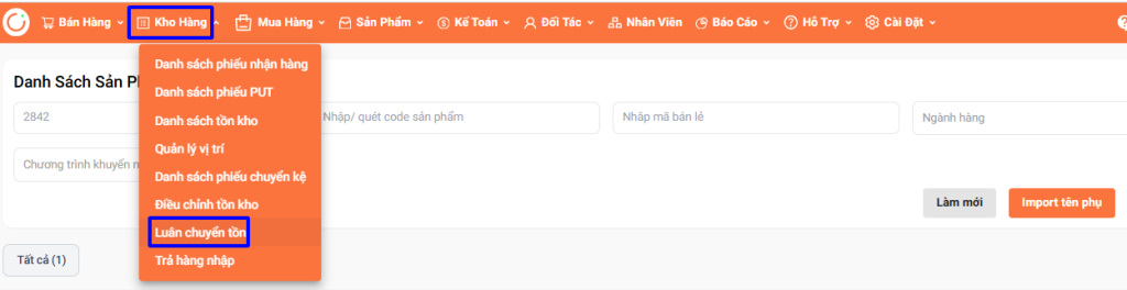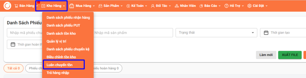 Truy cập ” Kho hàng ” -> Luân chuyển tồn