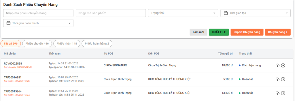 – Phiếu chuyển được lưu trữ tại cửa hàng chuyển hàng đi với mã TRF000001