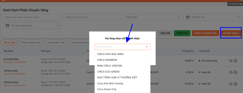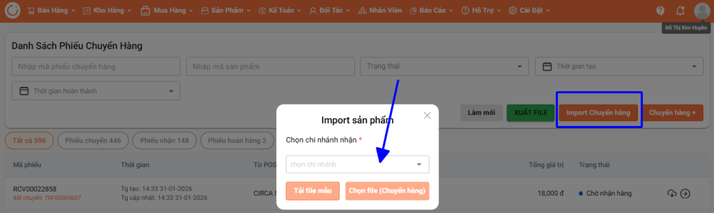 Click vào Import Chuyển hàng, chọn ” Chi nhánh nhận “