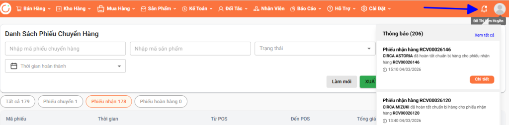 Cách 1: Truy cập vào quả chuông Thông báo -> Click vào thông báo nhận phiếu chuyển