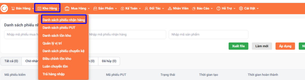 Cách 2: Truy cập ” Kho hàng ” -> ” Luân chuyển tồn” -> chọn Tab Phiếu nhận hàng