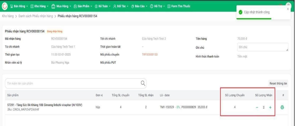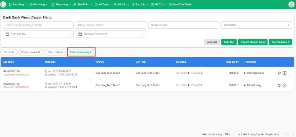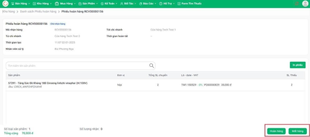 – Nếu mất hàng tại POS chuyển hàng (Tech test 1): Hệ thống tự động tạo 1 phiếu nhận hàng tương ứng tại cửa hàng chuyển. Phiếu nhận sẽ thuộc loại Phiếu hoàn hàng