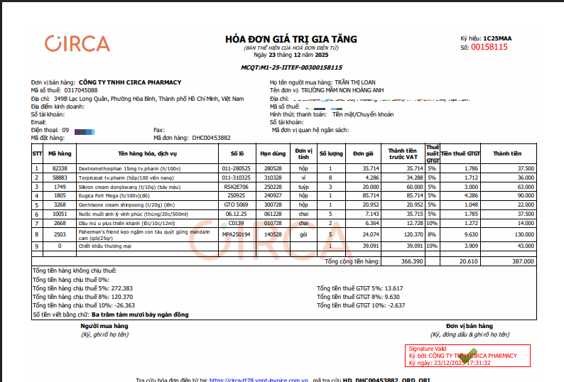 Phần mềm quản lý bán hàng của Circa có chức năng xuất hóa đơn bán hàng cho khách hàng lẻ khi mua hàng. Để có thể sử dụng chức năng này Nhà thuốc cần hoàn tất đăng ký với Circa tại thời điểm bắt đầu hợp tác.